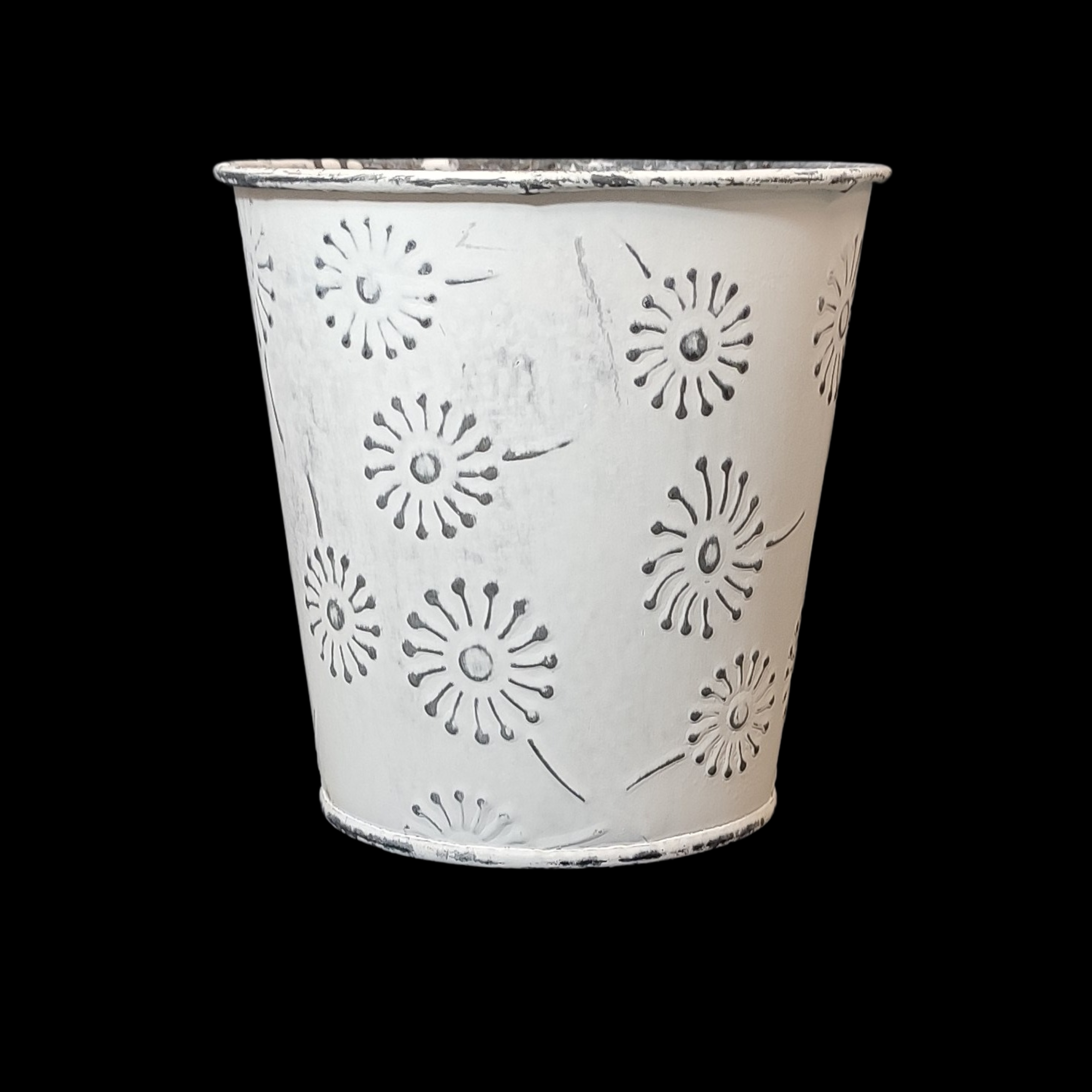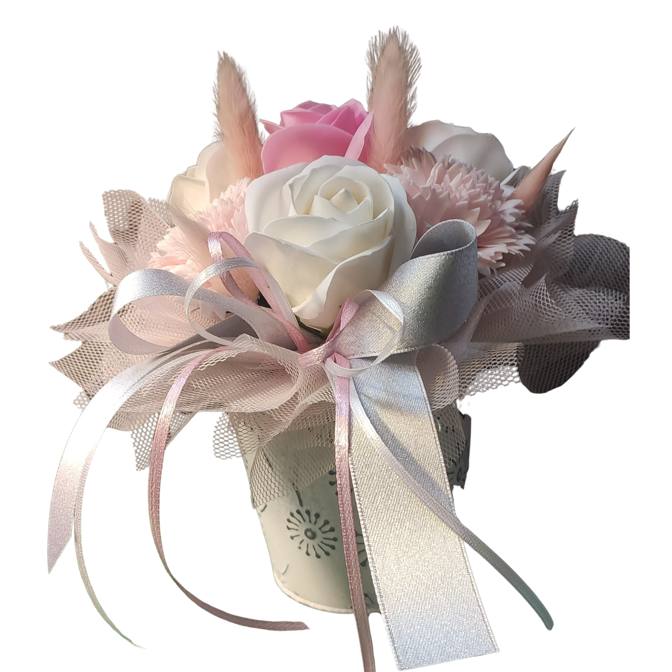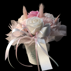 Jasny bukiet z mydlanych kwiatów w odcieniach bieli i bardzo delikatnego różu. Lekka, elegancka kompozycja w metalowej osłonce.
