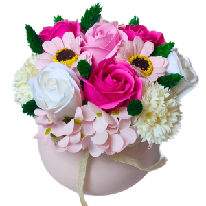 Bukiet mydlany złożony z różnych kwiatów, w tym róż, małych słoneczników i goździków, w odcieniach fioletu, różu i kremu, to idealny prezent na każdą okazję. Ten piękny i trwały bukiet nie tylko wygląda wspaniale, ale również pachnie pięknie i będzie przypominał o Tobie przez wiele dni. Bukiet umieszczony został w ceramicznej osłonce. To doskonały wybór dla każdego, kto kocha kwiaty i piękne prezenty.