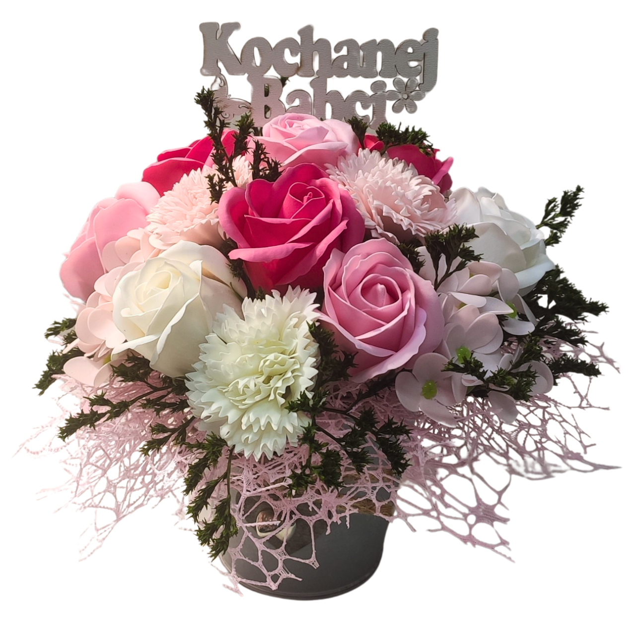 Kompozycja z kwiatów mydlanych: róż, goździków i hortensji w odcieniach różu oraz bieli została uzupełniona zieloną statycją i delikatną różową siatką florystyczną. Całość umieszczona jest w metalowej osłonce i ozdobiona białym topperem z napisem „Kochanej Babci”, który nadaje prezentowi osobisty, wzruszający charakter.