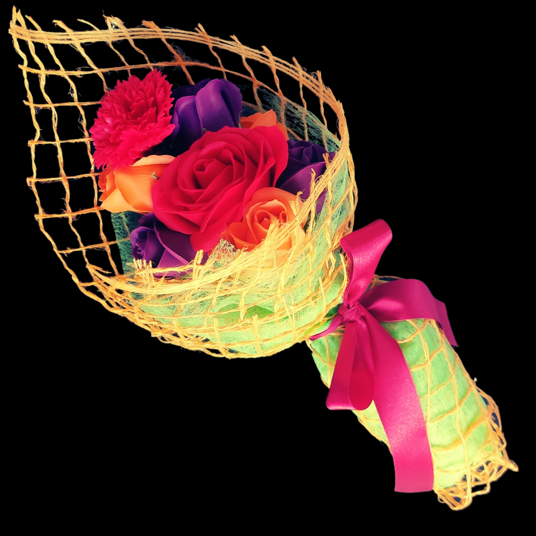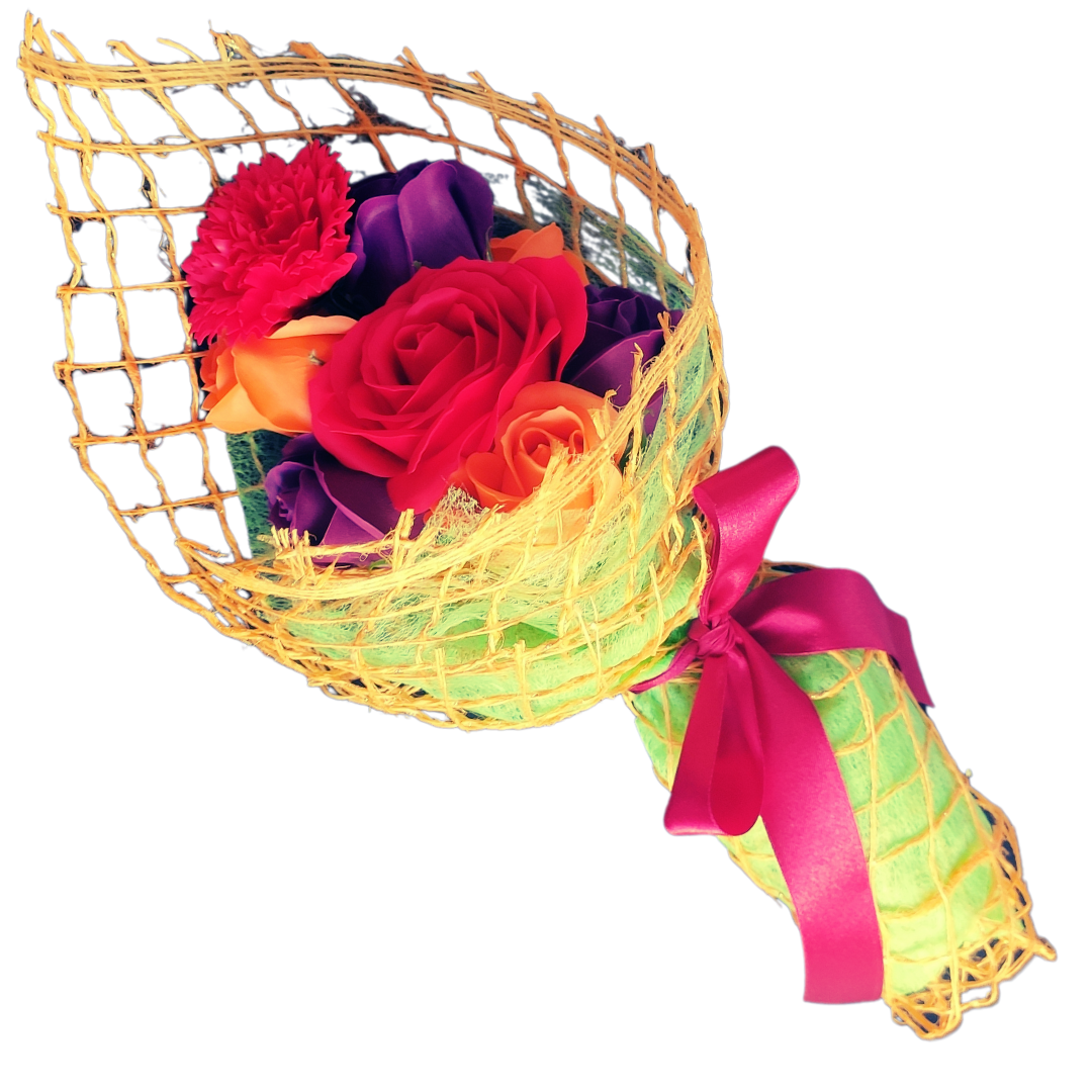 ale są wykonane z mydła. Bukiet jest otulony pomarańczowo złotą siatką i