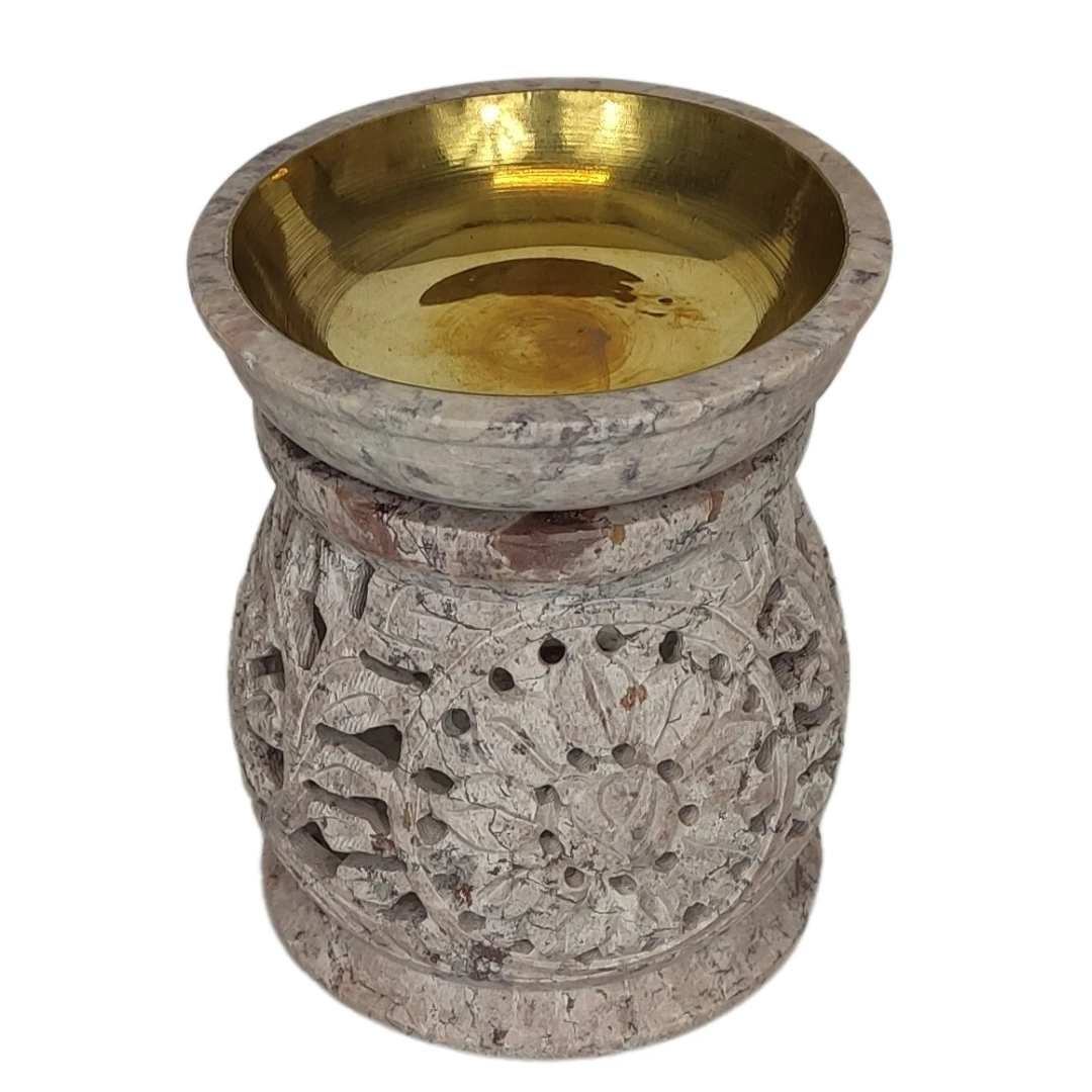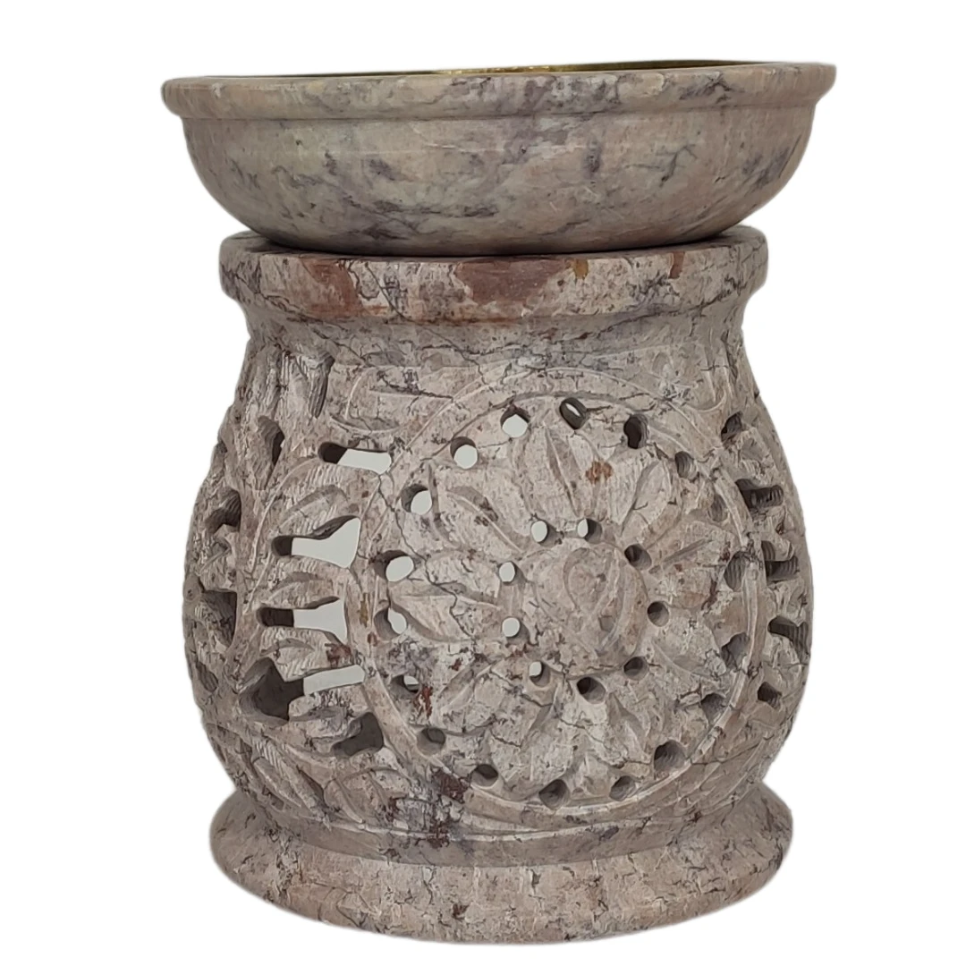 Ale to nie tylko estetyka czyni ten kominek wyjątkowym, ale także jego materiał wykorzystany do produkcji. Steatyt to minerał o jedwabistej fakturze i wyjątkowych wzorach, który łączy w sobie luksus i naturalność. Jest on również bardzo trwały i doskonale utrzymuje ciepło, co pozwala na szybkie wypełnienie pomieszczenia aromatycznymi olejkami.