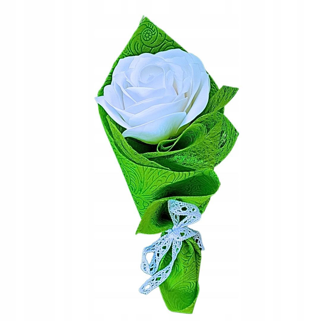 Delikatna i pachnąca róża mydlana zapakowana jako upominek. Idealna na komunię czy dodatek do ślubnego prezentu.